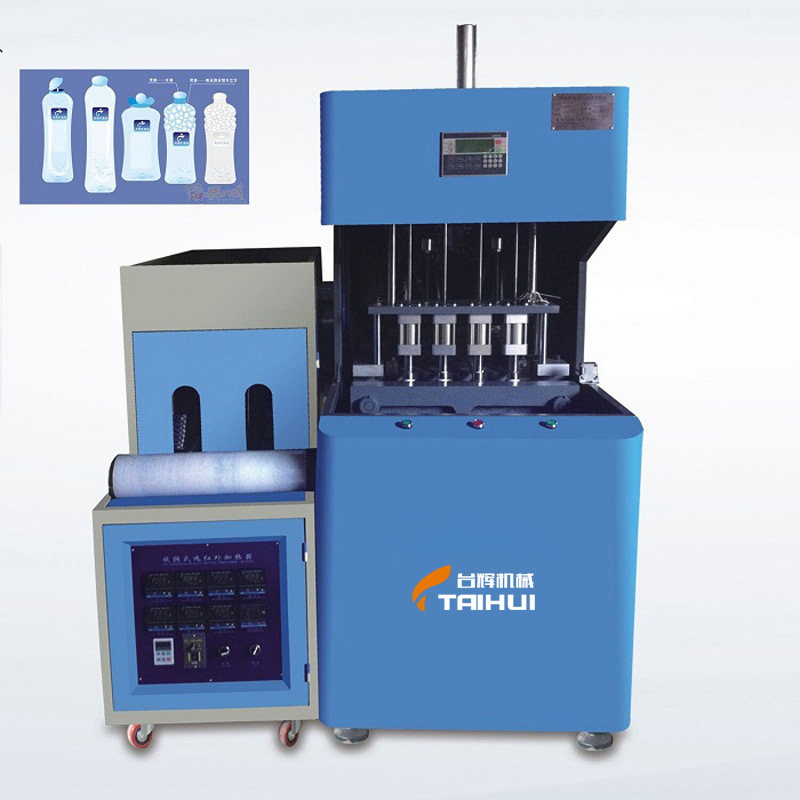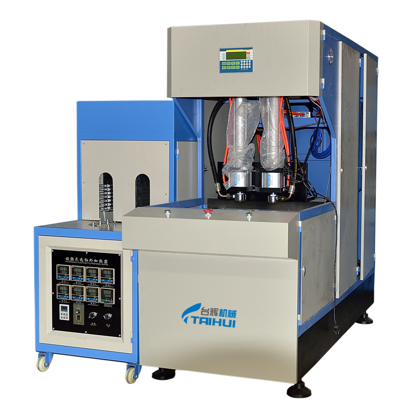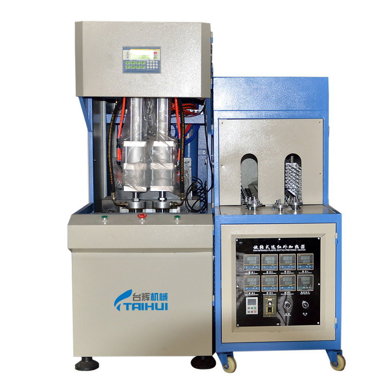 TH-5分為吹瓶主機(jī)以及旋轉(zhuǎn)紅外線加熱器兩部分。因?yàn)槠颗叩钠勘诒容^厚,普通的加熱系統(tǒng)達(dá)不到理想的瓶胚加熱效果,而紅外線加熱器可以穿透瓶胚內(nèi)外,并且加熱持久,均勻,保證了很好的成型質(zhì)量。